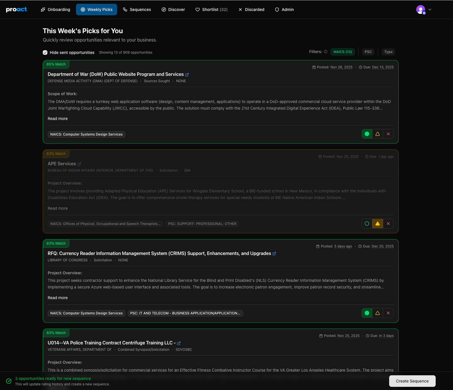 - Weekly Sequence (Precision Targeting): Select the bids you like (Approved) from your Weekly Picks. We automatically target Prime Contractors with relevant past performance on those specific agencies to generate high-quality leads.