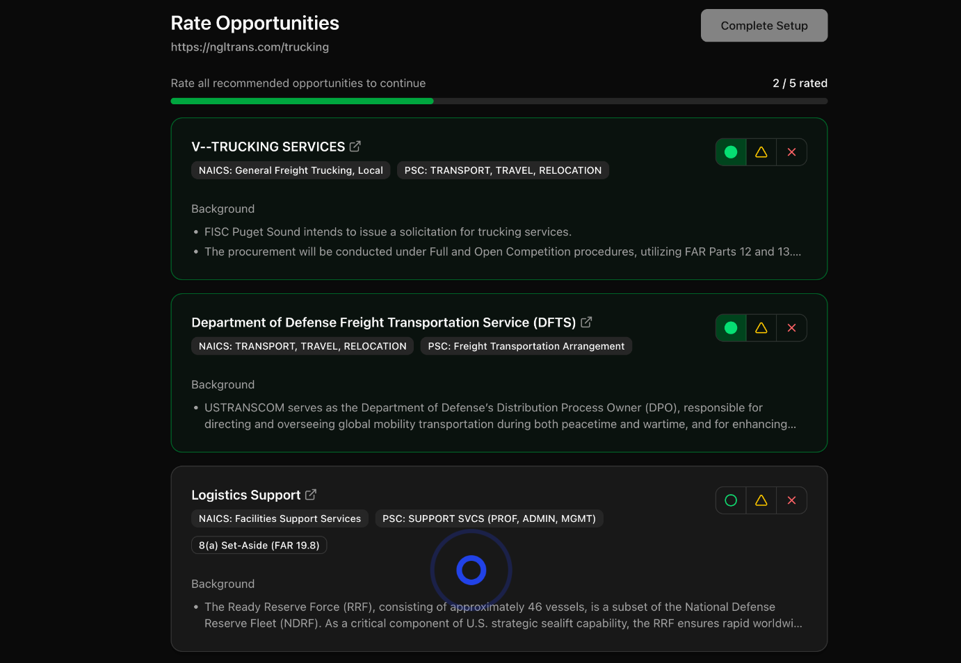 You then review those 5 bids and mark which ones you can truly perform using a quick O / △ / X click inside our platform. This quick human feedback loop helps our model fine-tune relevance by combining AI prediction with your real-world capability.