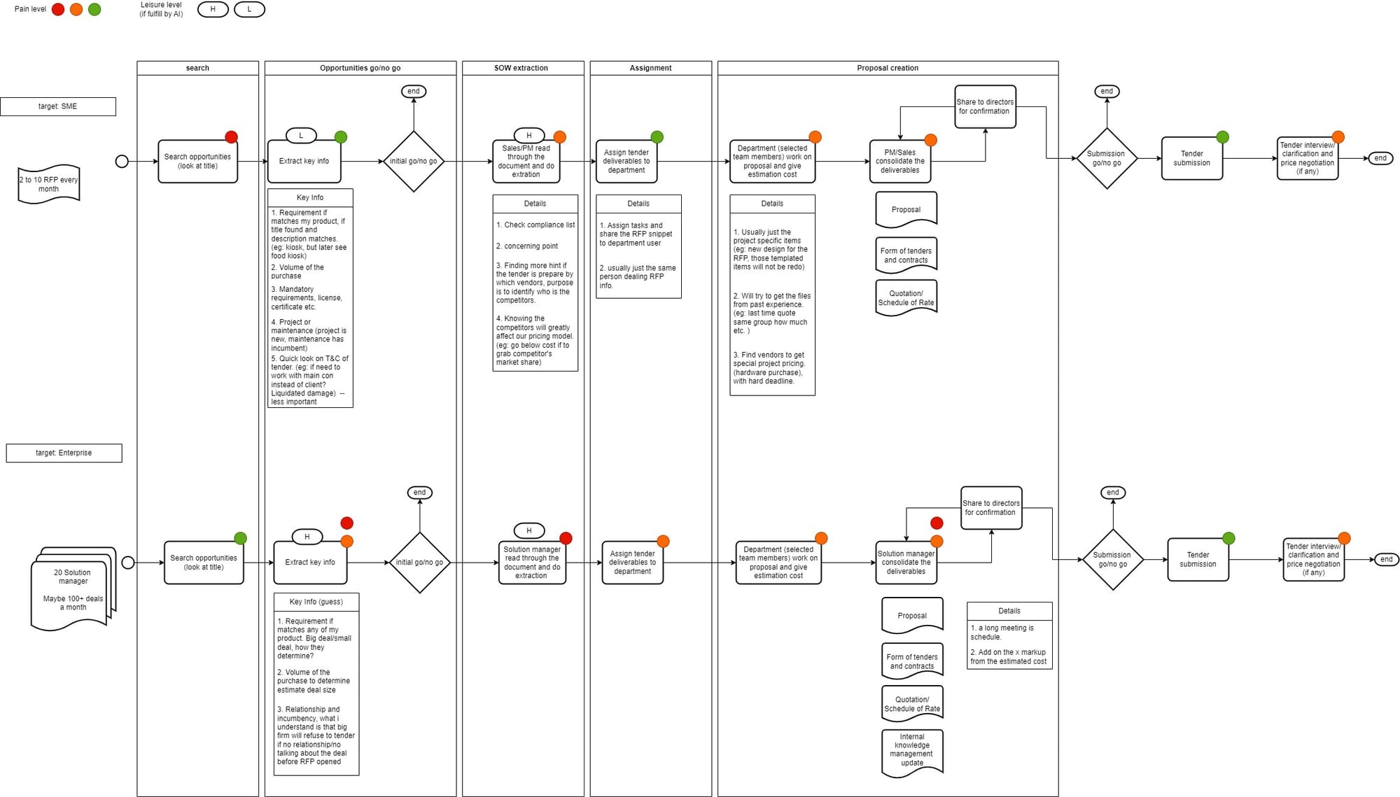 - Enterprises (High Pain – 🔴): Large projects often come with RFPs that exceed 1,000 pages, requiring multiple teams to extract key details, making this a labor-intensive step.