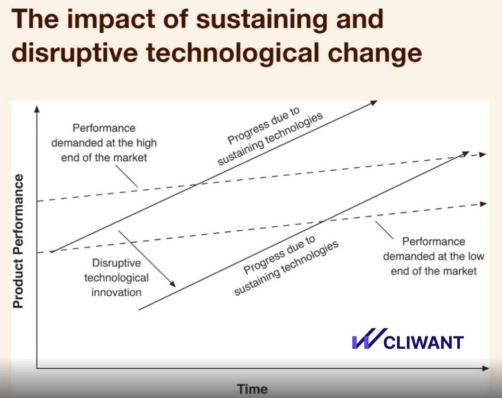 Many assume AI and automation will eliminate these pains, but the reality is more nuanced. Looking at the second image referencing The Innovator’s Dilemma (Christensen, 2016), we see that sustaining technologies continue to improve, often surpassing user needs. Disruptive innovation, however, changes the game entirely.