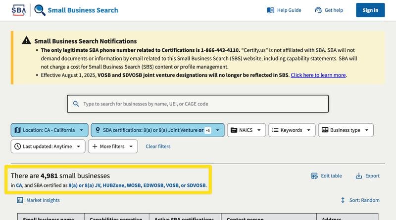 If you filter for California companies with all set-aside certifications, you’ll narrow it down to 4,981. Tada 🎉